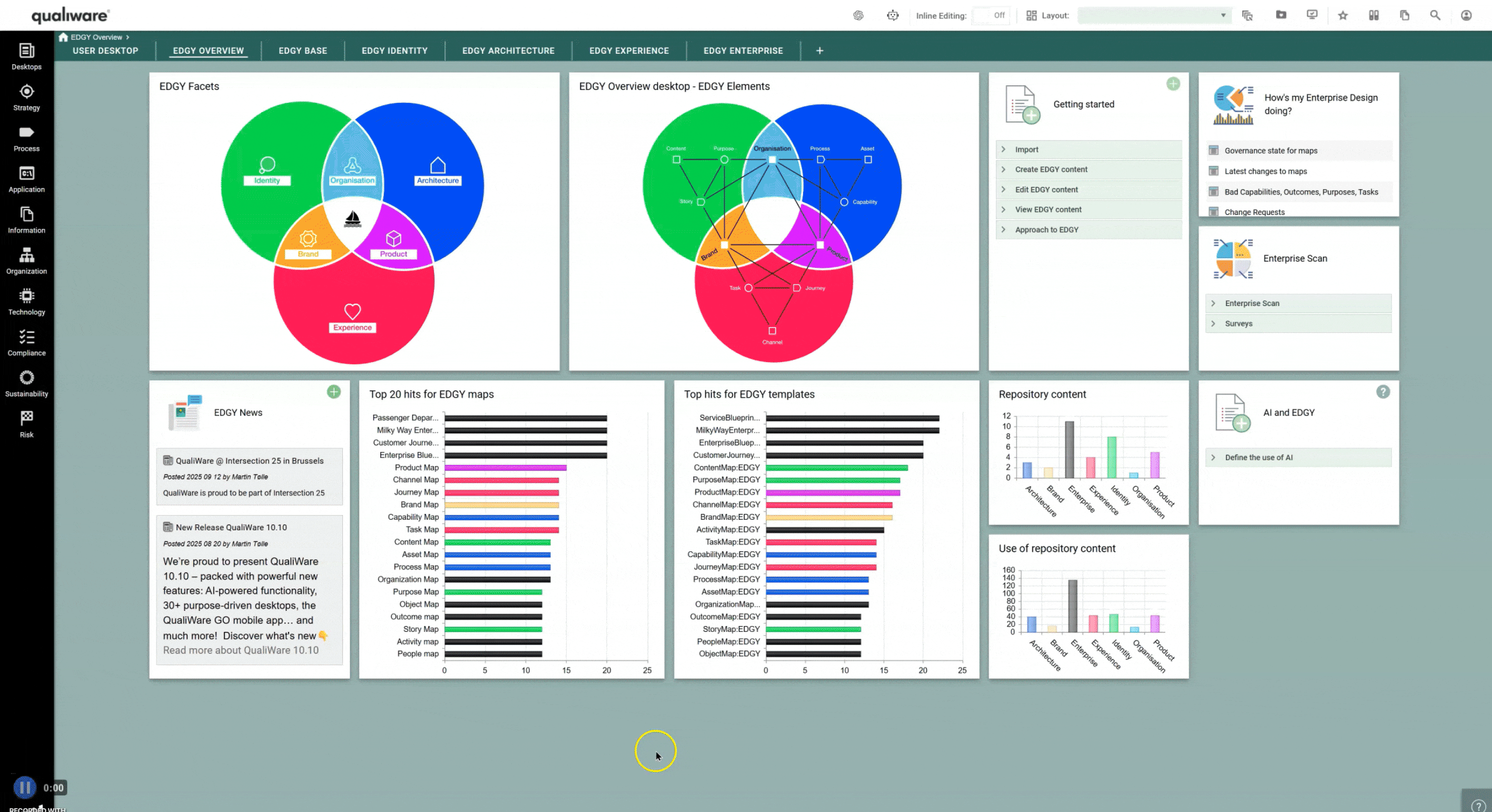 EDGY is a tool for designing and improving organizations. It bridges the gaps between strategy, operations, and innovation, and integrated with QualiWare, it transforms enterprise design from static models into a dynamic, collaborative, and governed process.